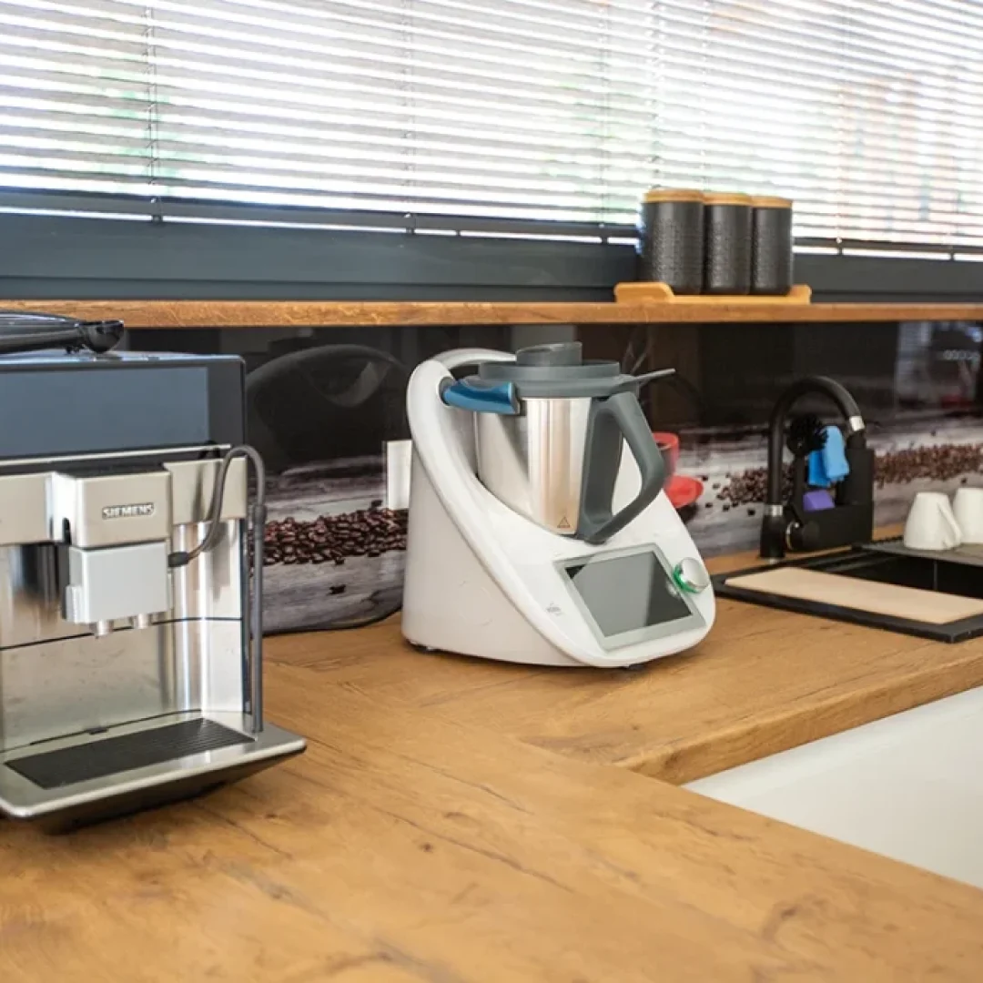 Dom Masuria Rosa wyróżnia się wysokim standardem i kompletnym wyposażeniem. Goście znajdą tu wszystko, co potrzebne do komfortowego spędzania czasu w ciągu dnia, a także przygotowywania posiłków. Bogato wyposażona kuchnia posiada nowoczesną lodówkę z kostkarką do lodu, piekarnik, zmywarkę, ekspres do kawy oraz funkcjonalny robot kuchenny Thermomix.