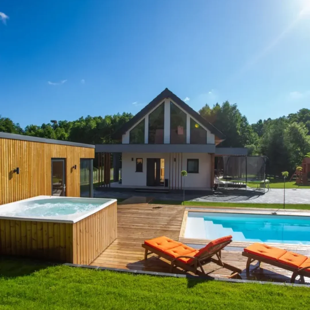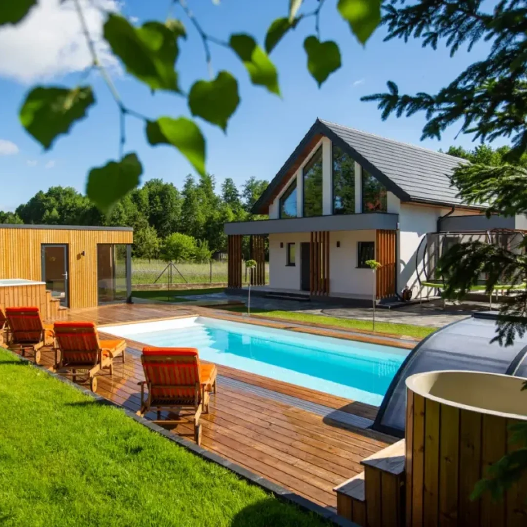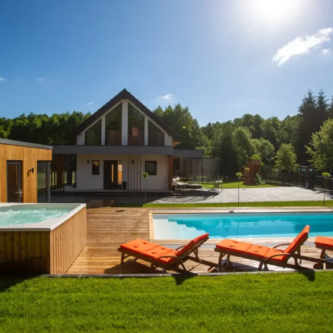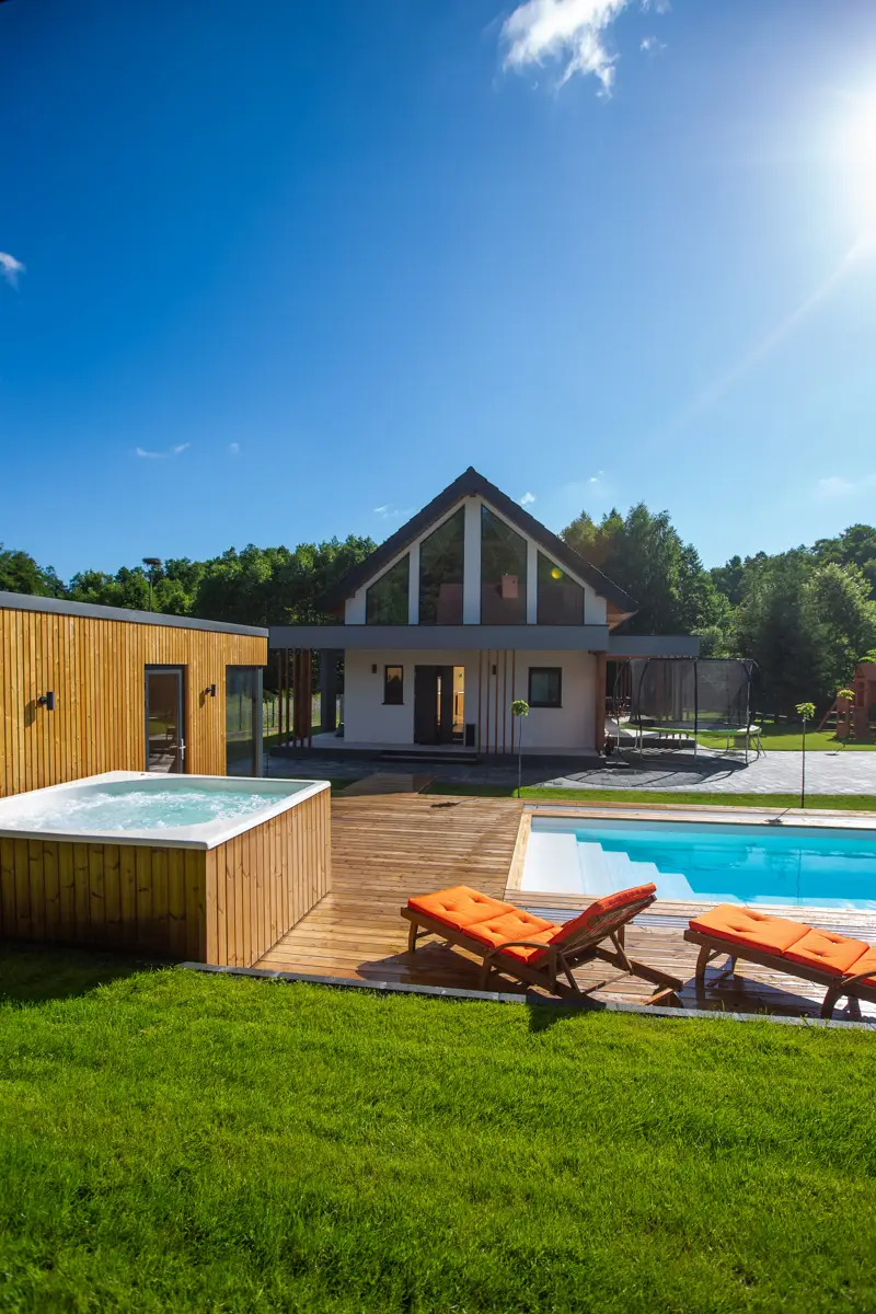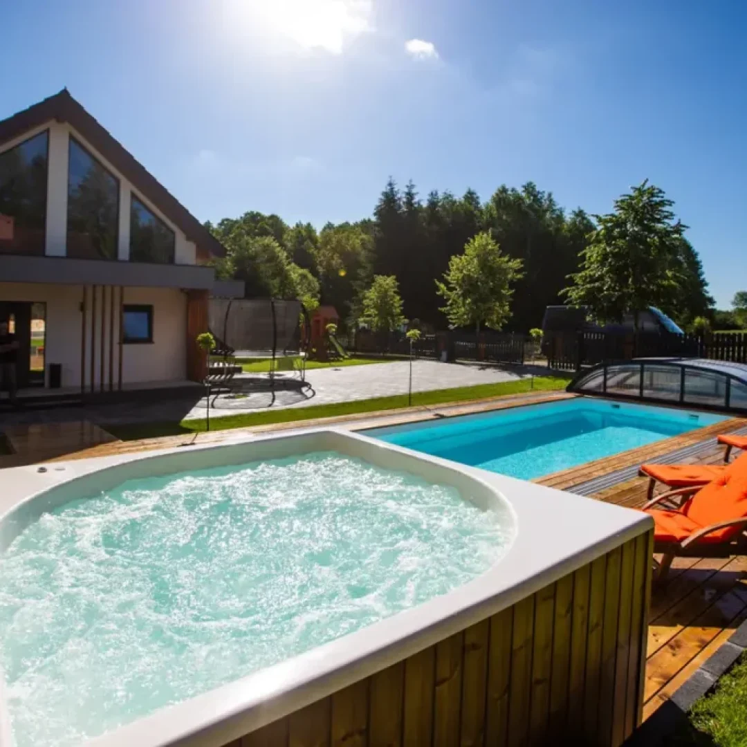 Strefa spa w domu Masuria Rosa to oaza relaksu i luksusu. Goście mogą tu skorzystać z sauny, jacuzzi oraz bali ogrodowej, aby odprężyć się po dniu pełnym aktywności. Dodatkowo basen pozwala na orzeźwienie w cieplejsze dni. Ta wyjątkowa strefa została stworzona, aby zapewnić gościom pełen komfort i relaks podczas ich pobytu, otoczony pięknem przyrody Mazur. Taras w Spa wyposażony w leżaki, na których można opalać się w słoneczne dni.